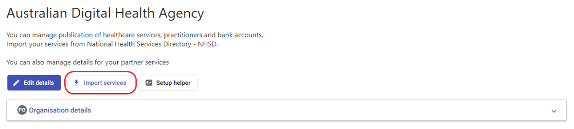 If you have services recorded in the National Health Service Directory (NHSD), you can import them into Provider Connect Australia (PCA). You can initiate the import services function from and organisation screen (see example below) or from a location that you offer healthcare services at.